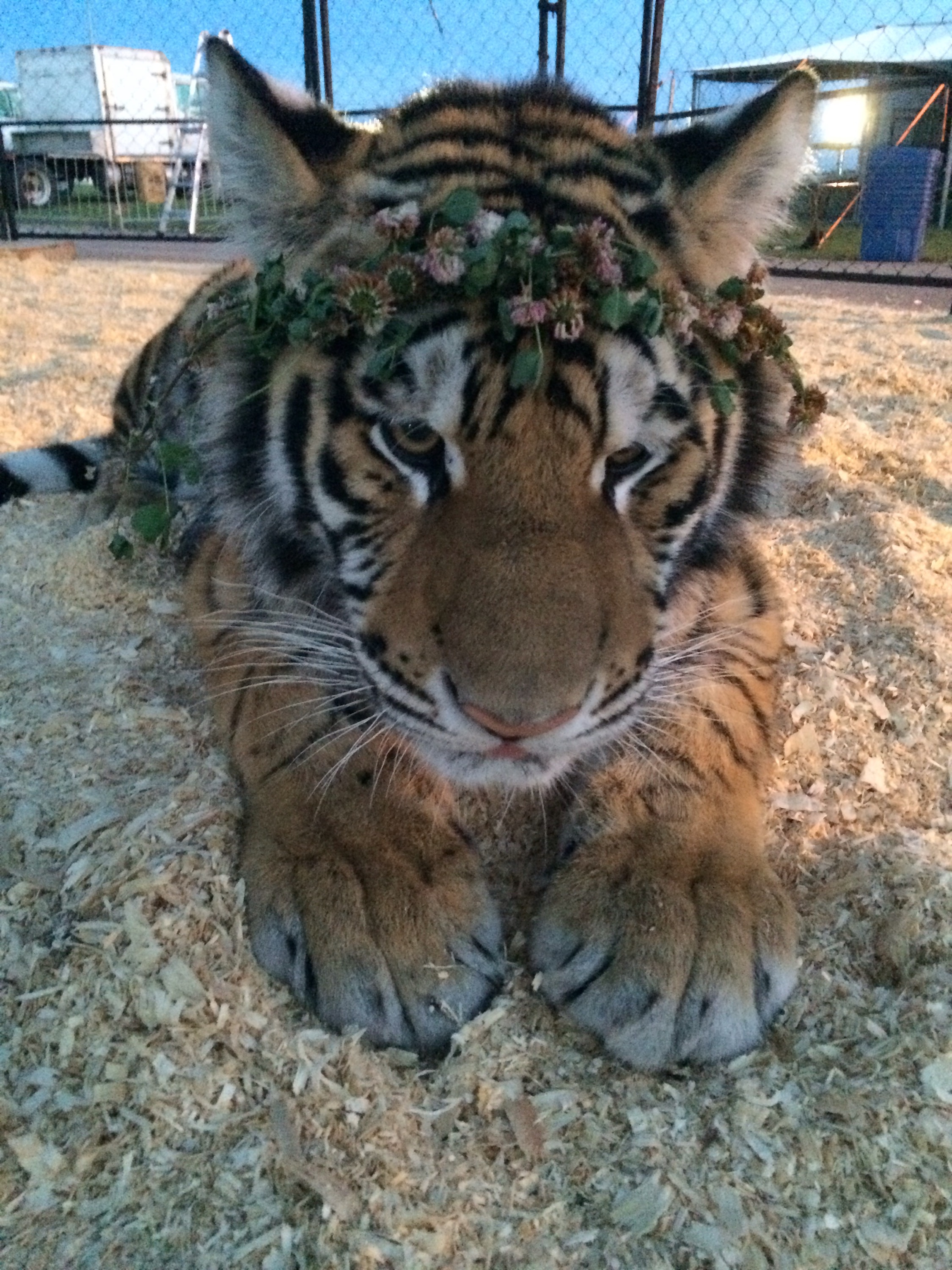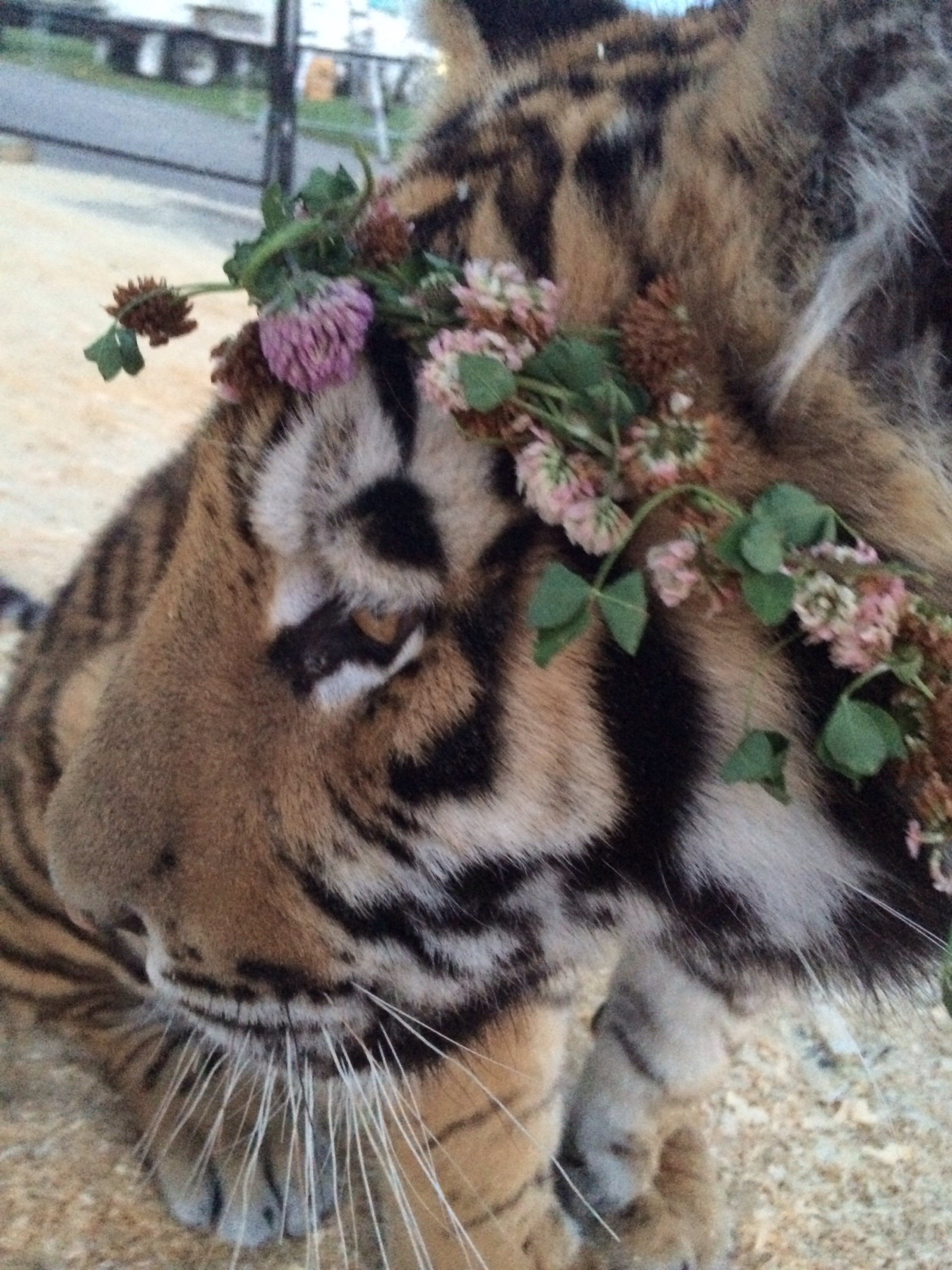 Now onto the furry critter you came to see… Uno, the Siberian Tiger! Uno wearing a special flower crown that Maddy made him!