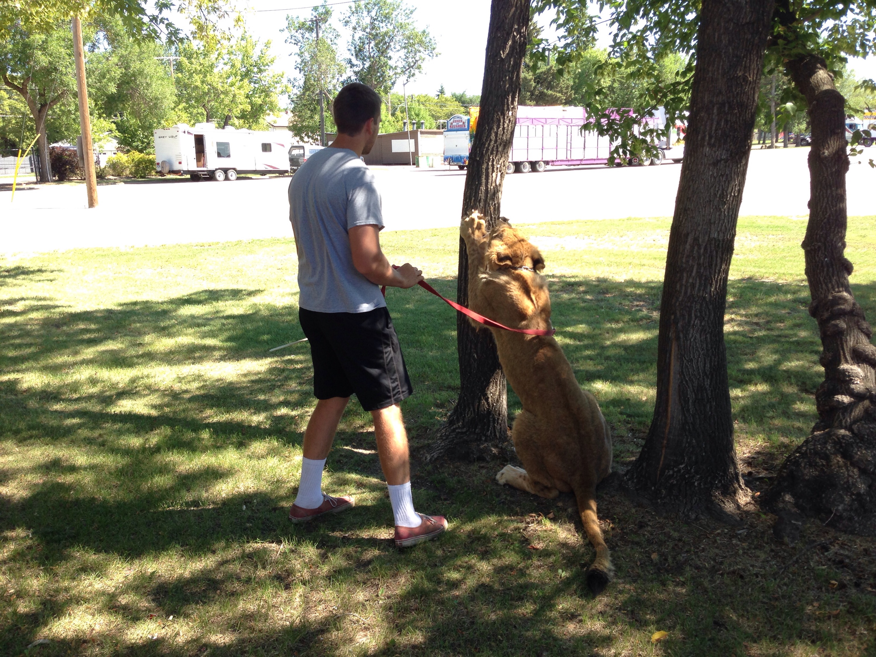 Before this blog post begins, let’s first discuss the elephant in the room. I’d like to remind everyone however we have no elephant on tour with us, so I am speaking proverbially. Unfortunately due to a severe lack of wifi, a busy schedule, and good ole’ absent-mindedness, I am rather behind on my blog posts… But I am aiming to catch up as soon as I can..! Maddy and Uno relax alongside the midway.