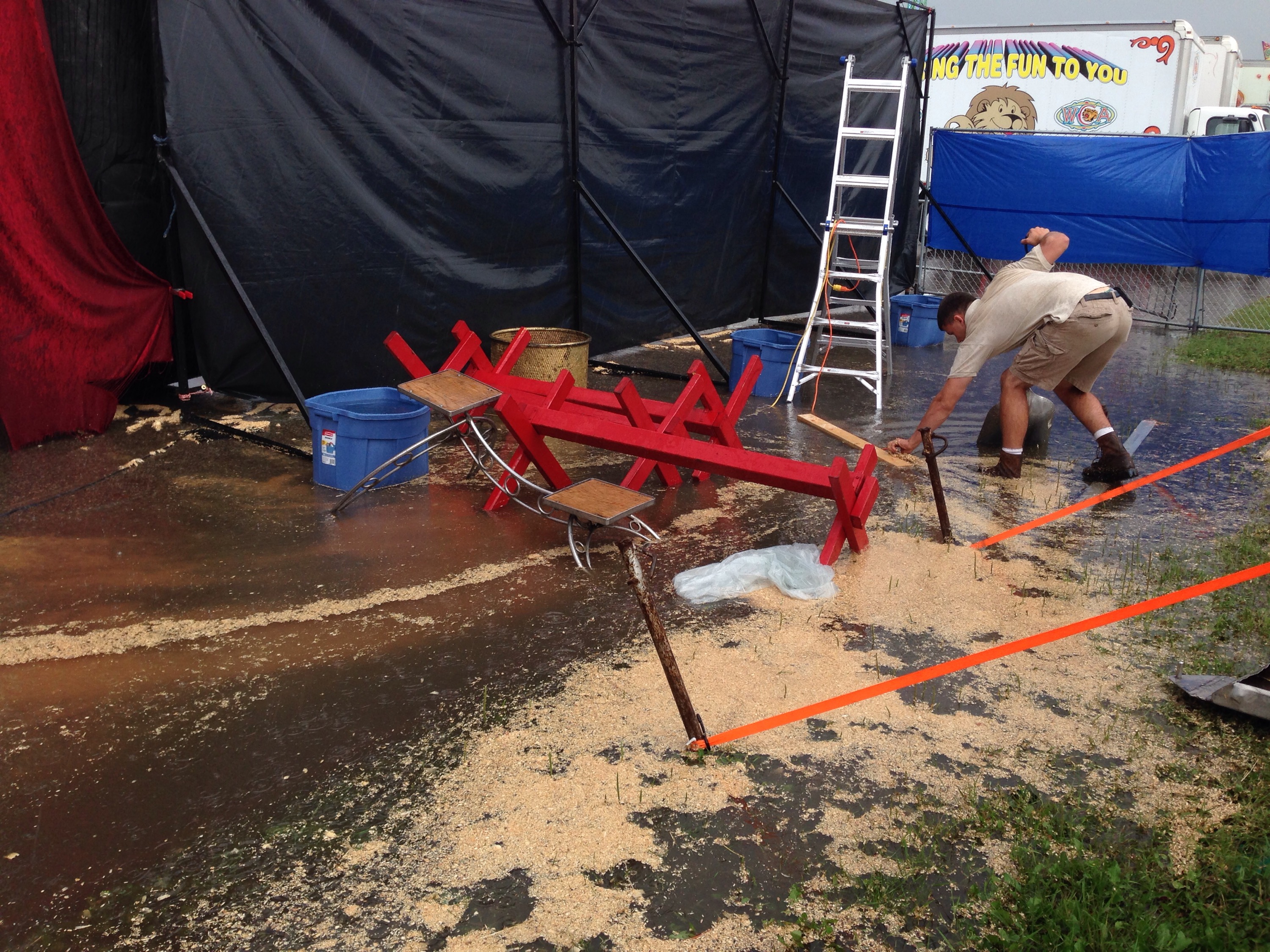 At one point the water was nearly knee high.All the wood shavings from our show arena floated towards and subsequently clogged the storm drain in the middle of our set-up, soaking our equipment, and our feet in the futile attempt we made fighting it.