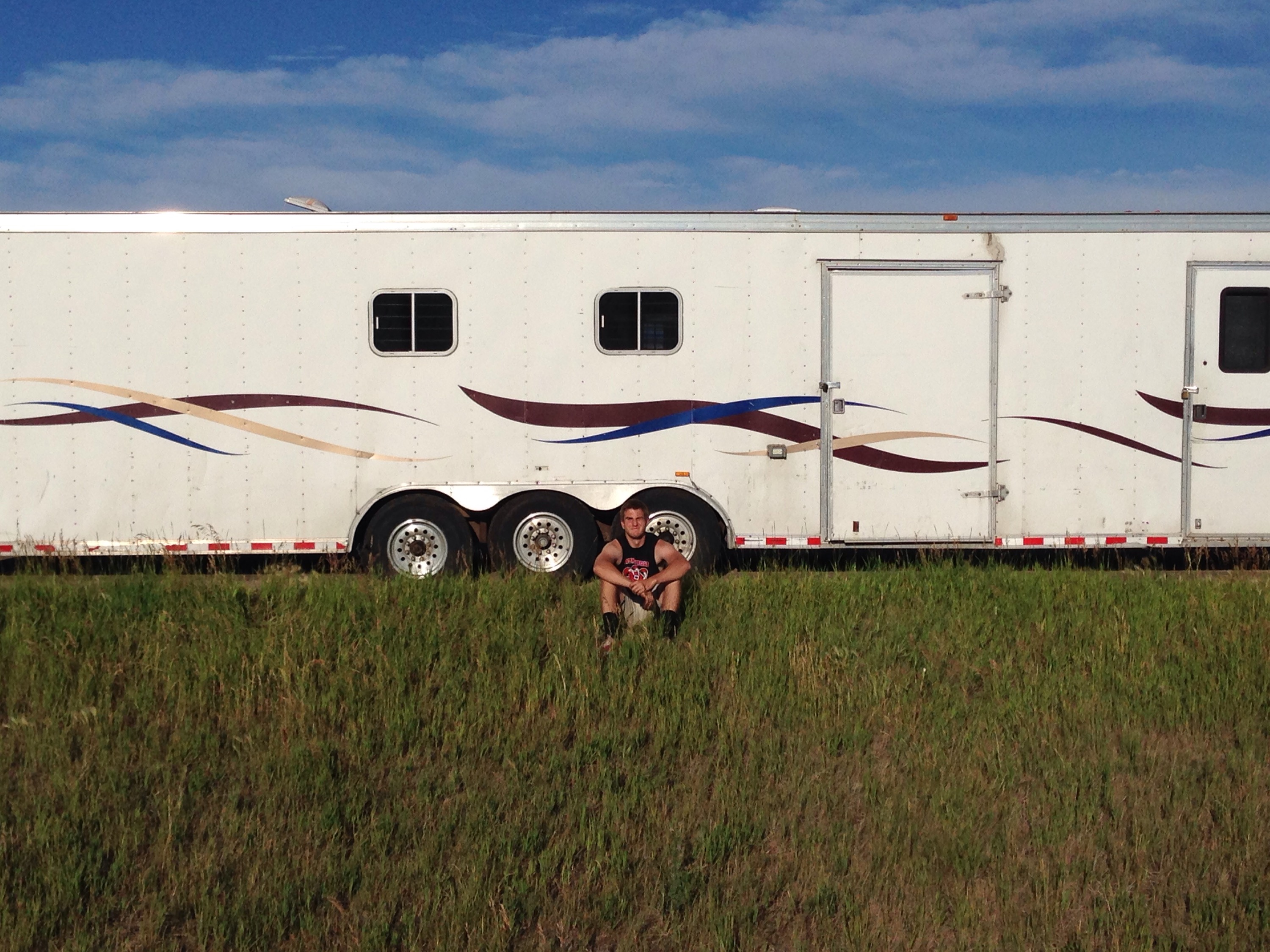 McKenzie sits by our broken down trailer. Another scenic place to have the vehicle breakdown.McKenzie takes the oppurtunity to do some stretches.