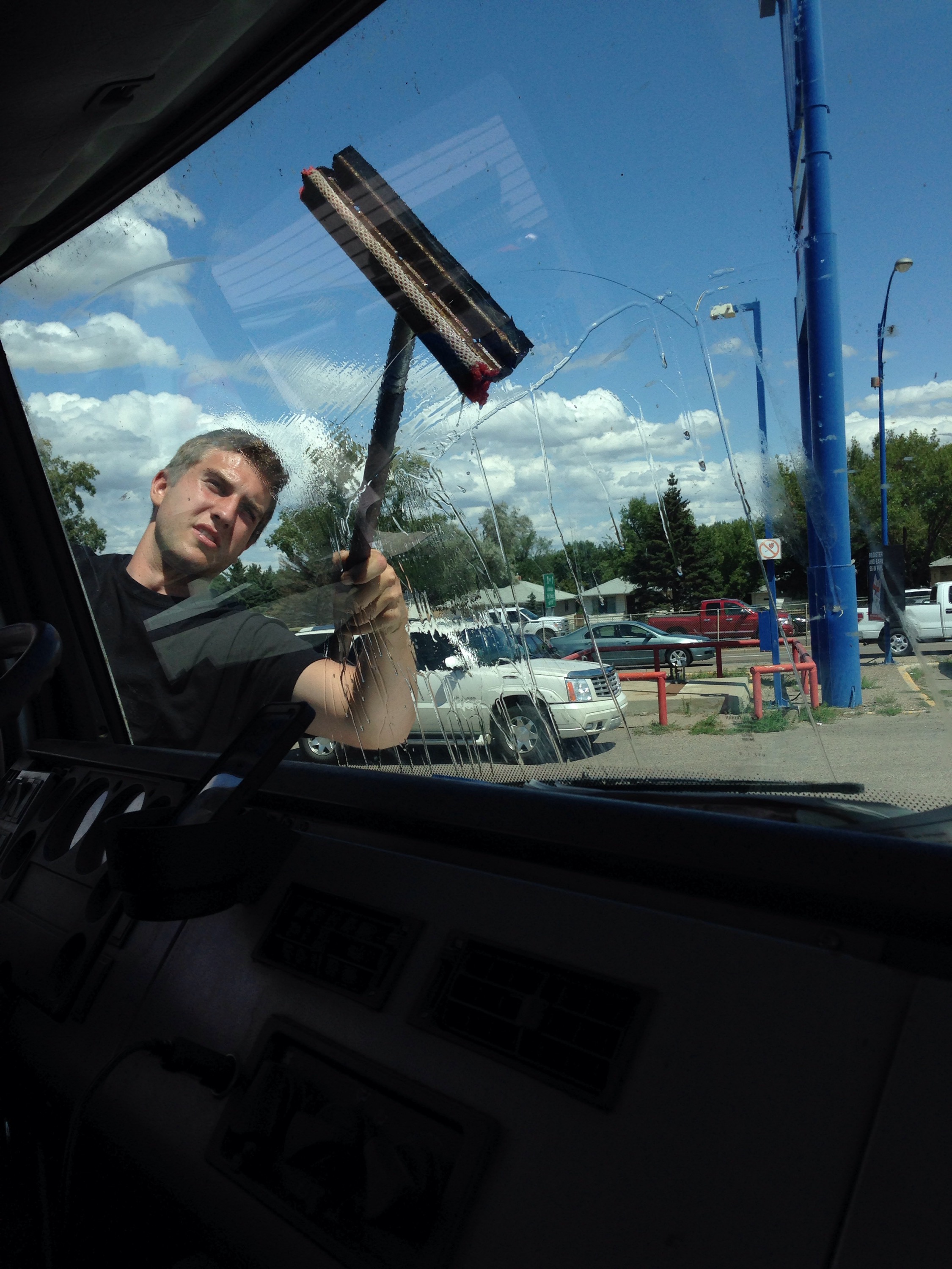 Before you tear up from the beauty of this gorgeous gorge, let’s go back to this morning to catch you up. We left Medicine Hat bright and early and began our drive to “Saskatoon, Saskatchewan” (try saying that 5 times fast..). McKenzie washing our windshield at a has station, because we’ve learned I am not very good at it.