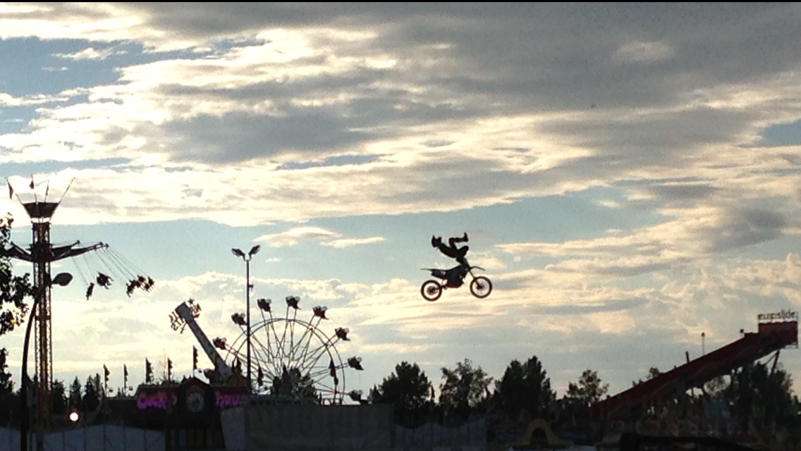 A dirt-bike flies through the air amongst the carnival attractions as the sun sets.