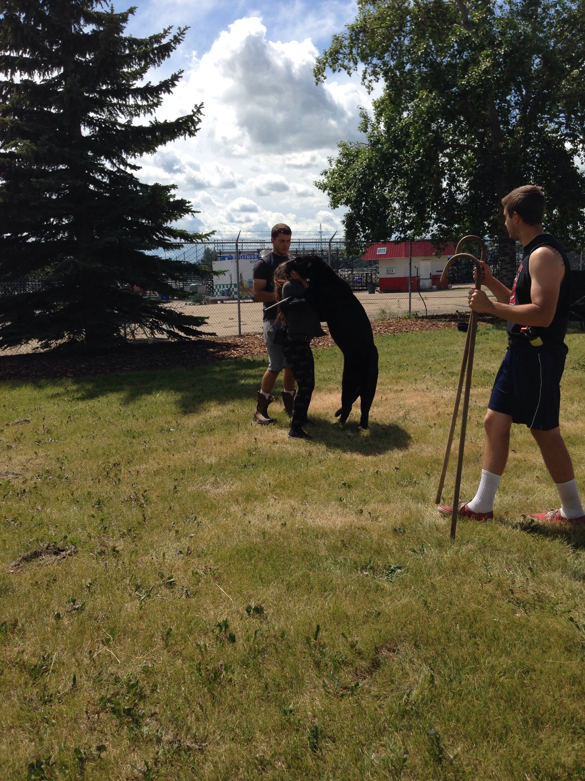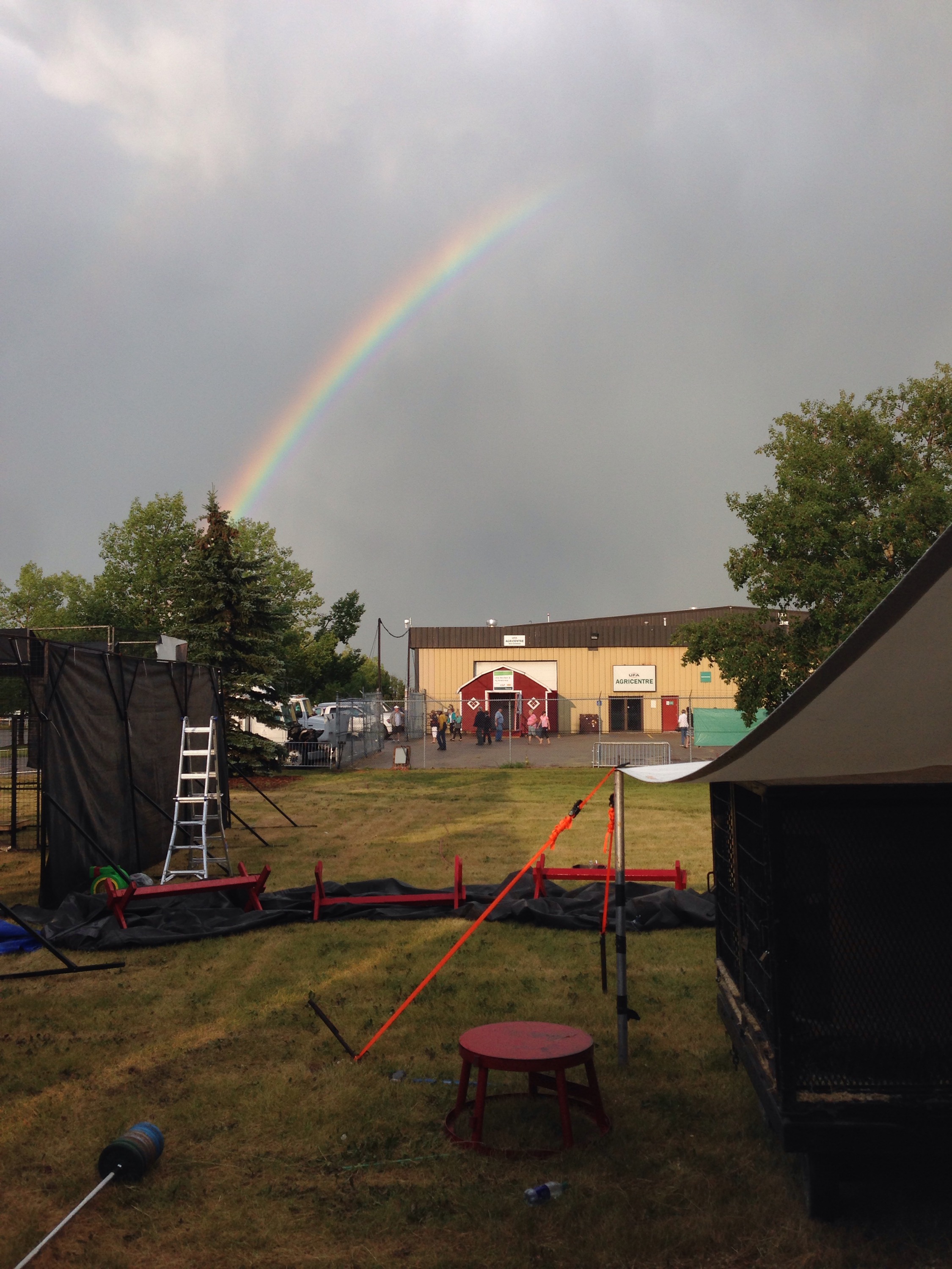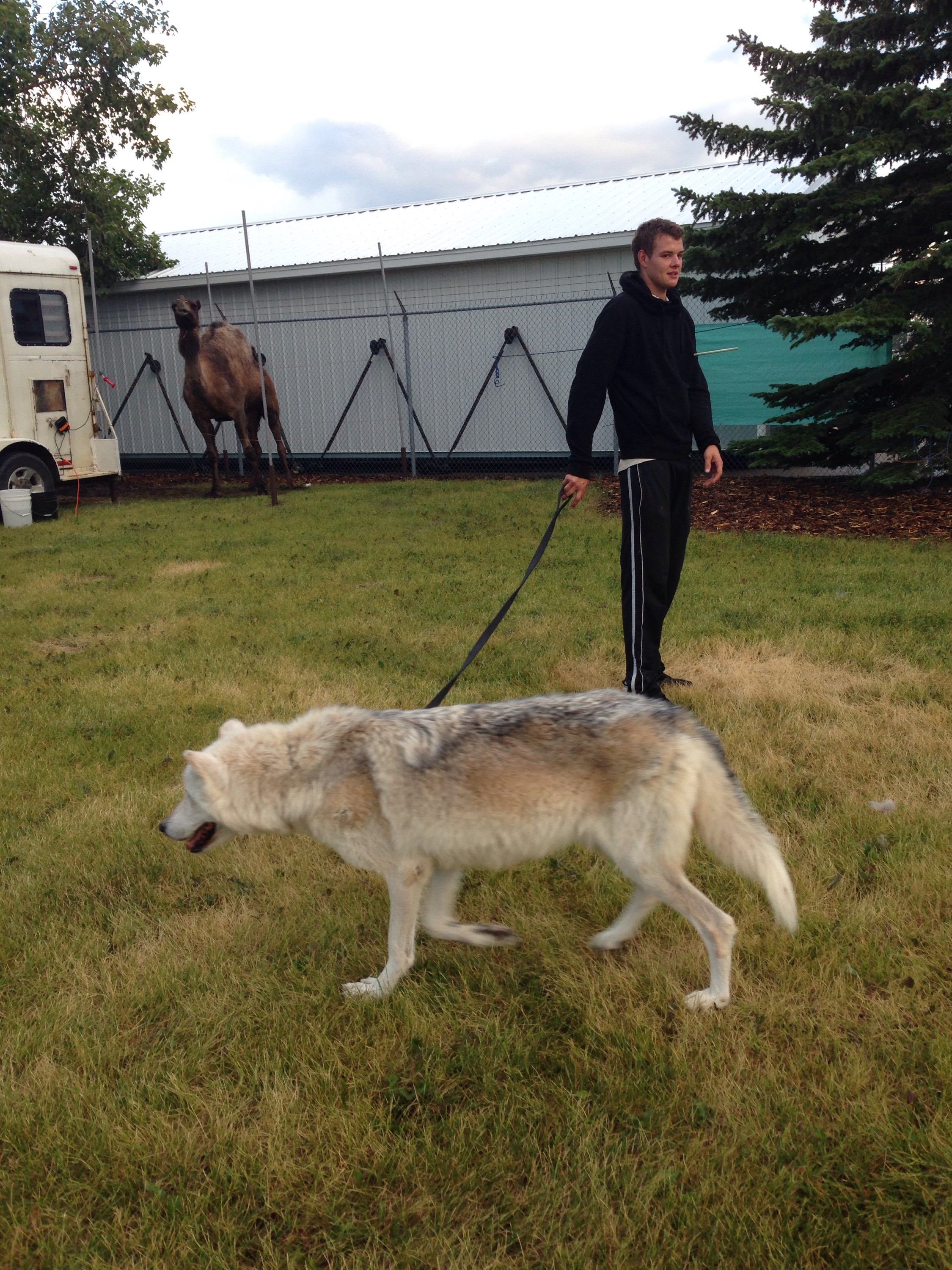 Today was our last day of shows here in Lloydminster, and the general feeling was that of relief, as our location in the middle of a parking lot was less than ideal, not to mention the heat and wind. After what felt like a relaxed morning, I got all cozy and set up to do some serious psychology studying… Not much sooner than had I sat down, all hell broke loose. It started by the wind catching in our tarps, and knocking over half of our people barriers… Shoot. After up righting the overturned panels, the pole holding up a shade tarp in the arena with the lions and tiger fell down… Shoot. Did I mention Dirk was out grocery shopping? This was going to be a “three of us problem”… After some persuading of the cats to stop chewing on the pole, and some resting, the madness was mostly over, leaving a whole few minutes before shows… Shoot.