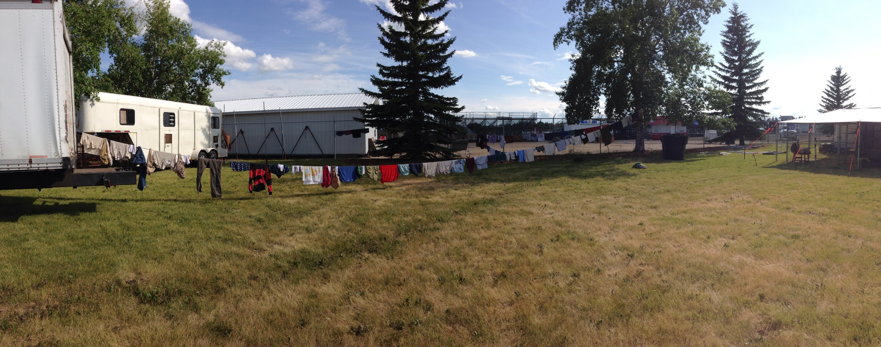 While at first it’s an endearing concept, It is quickly spoiled by the knowledge that “I just put a load into Kelly”. We didn’t have much time to stick around the laundry place, which meant that “Jewel”, my promiscuously named drier, didn’t have time to get hot enough to finish the job…[There it is again..]. This meant only one option upon arrival back at the fair… Drying our clothes gypsy style.